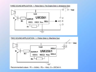 This mini project discusses the design of an emergency alarm circuit using the low-cost IC UM3561, which can produce four distinct sounds for alarms. It outlines the circuit components and applications of fire and burglar alarms, emphasizing their importance for safety and security in various settings. The project also includes a bibliography of resources for additional information on alarm systems.
