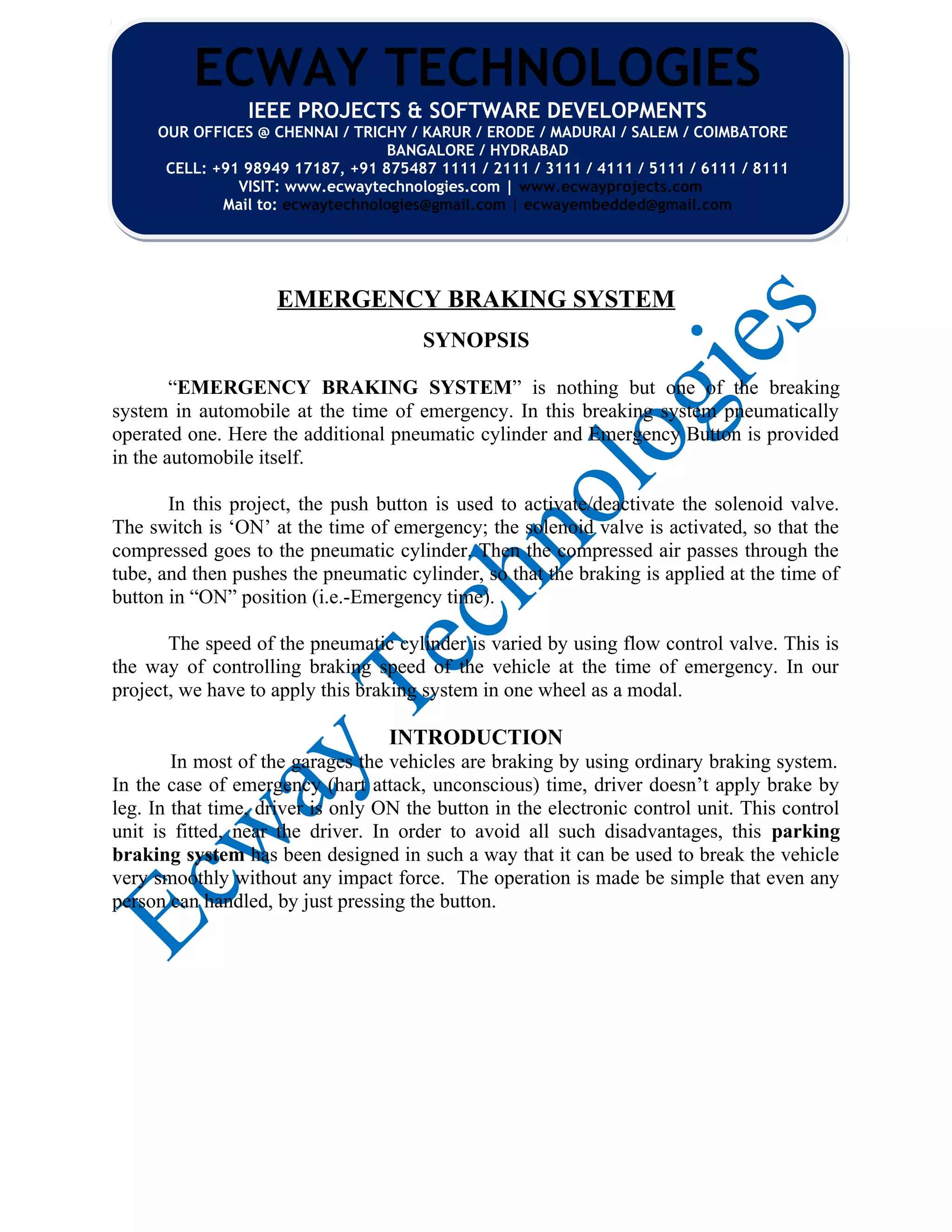 The emergency braking system is a pneumatic-operated braking mechanism designed for automobiles to function during emergencies, activated via a push button that controls a solenoid valve. This system allows the vehicle to stop smoothly without the driver needing to use their legs in critical situations, and includes components like a pneumatic cylinder and flow control valve for braking efficiency. While it presents advantages such as lower cost and simplified operation, it requires a separate air tank and is meant primarily for emergency use.