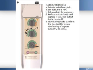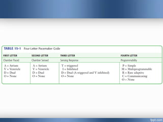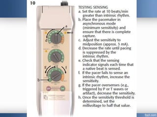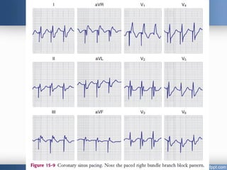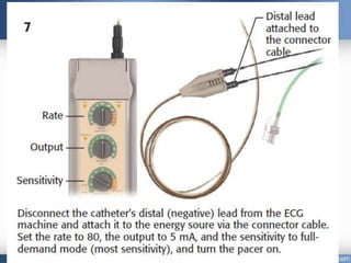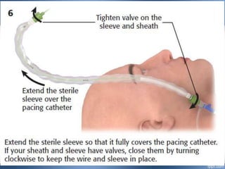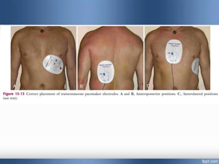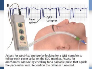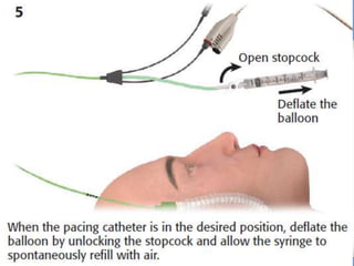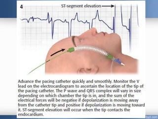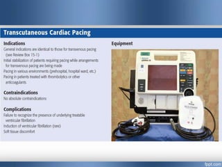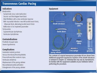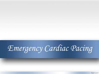 Emergency cardiac pacing can be done prophylactically or therapeutically for symptomatic bradyarrhythmias. Transcutaneous and transvenous pacing are commonly used in emergency departments, with transcutaneous being preferred when time is critical due to its quick noninvasive setup. Transvenous pacing involves inserting a pacing catheter into a vein and threading it to the heart, which can typically be done in under 20 minutes. It is useful for patients requiring prolonged pacing or with high risk of heart block. The document provides details on indications, contraindications, equipment, and techniques for emergency transvenous cardiac pacing.