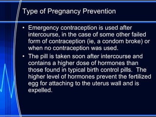 Emergency contraception, also known as the morning after pill, can be used after intercourse if other contraception fails or was not used. It works by preventing fertilization through high doses of hormones that stop an egg from implanting in the uterus. While it prevents pregnancy, it does not protect against sexually transmitted infections. The morning after pill is intended for single use within a short window after sex. Possible side effects include nausea, vomiting, and headaches. It ranges in cost but can be $10-$70 without insurance. Effectiveness varies by specific pill but is generally 50-90% if taken soon after intercourse.