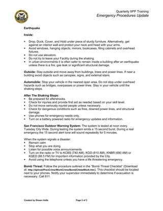 This document provides guidance on emergency procedures for a facility. It outlines key details staff should know, such as how occupants will be notified of emergencies, the designated place of refuge, locations of emergency equipment like fire extinguishers and supplies, and evacuation routes including alternate exits. Scenarios covered include responding to fires, earthquakes, bomb threats, and suspicious items. Staff are instructed to ask their supervisor for any facility-specific procedures and plans.