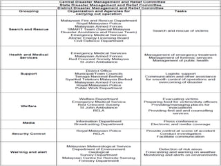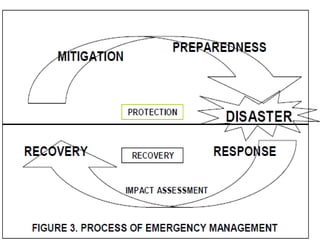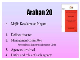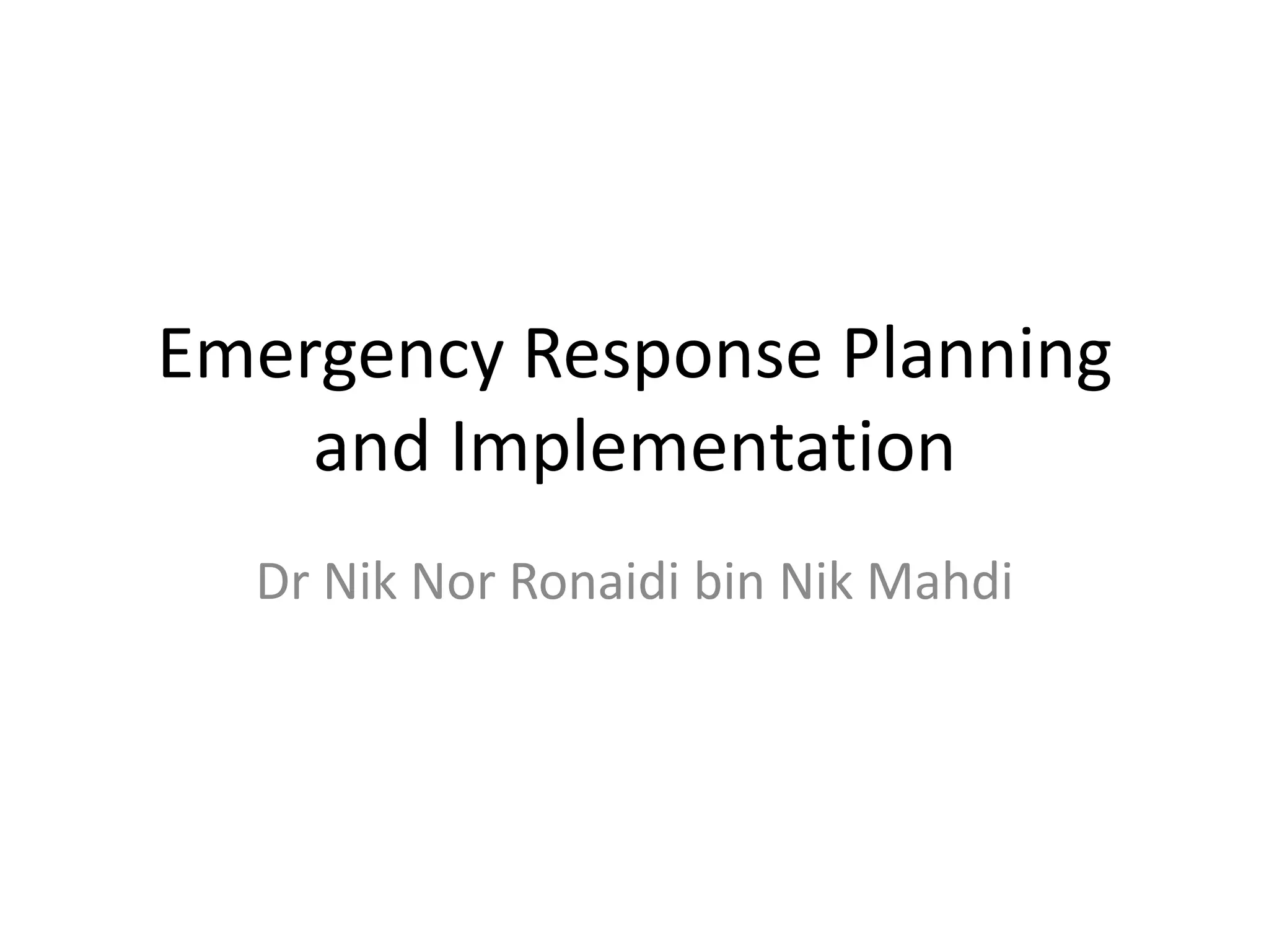 This document discusses emergency response planning and implementation. It begins with introductions to emergencies, disasters, and emergency response plans. It then outlines the emergency management process, including the preparedness, response, recovery, and mitigation phases. Key legislation regarding emergency response in Malaysia is also summarized, such as the Occupational Safety and Health Act and National Security Council Directive No. 20. The document provides more details on the Control of Industrial Major Accident Hazards Regulations, including definitions of major hazard installations and indicative criteria for very toxic, toxic, flammable, and explosive substances.