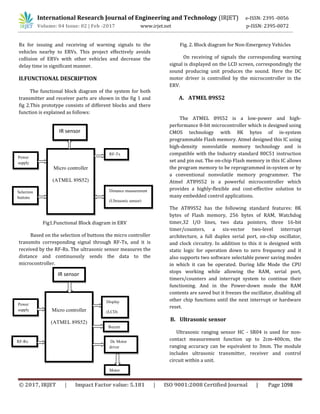 This document describes an emergency vehicle detection system that uses RF modules and ultrasonic sensors to clear lanes and avoid collisions. The system aims to reduce delays and accidents involving emergency response vehicles (ERVs) by controlling nearby vehicles' speeds. When an ultrasonic sensor on an ERV detects an obstacle too close, it sends a control signal to that vehicle's microcontroller to limit its speed. RF transmitters and receivers enable communication between the ERV and other vehicles to issue warning signals and adjust speeds as needed for lane clearance and collision avoidance. The system is intended to provide greater safety for ERVs through intelligent control of nearby traffic.