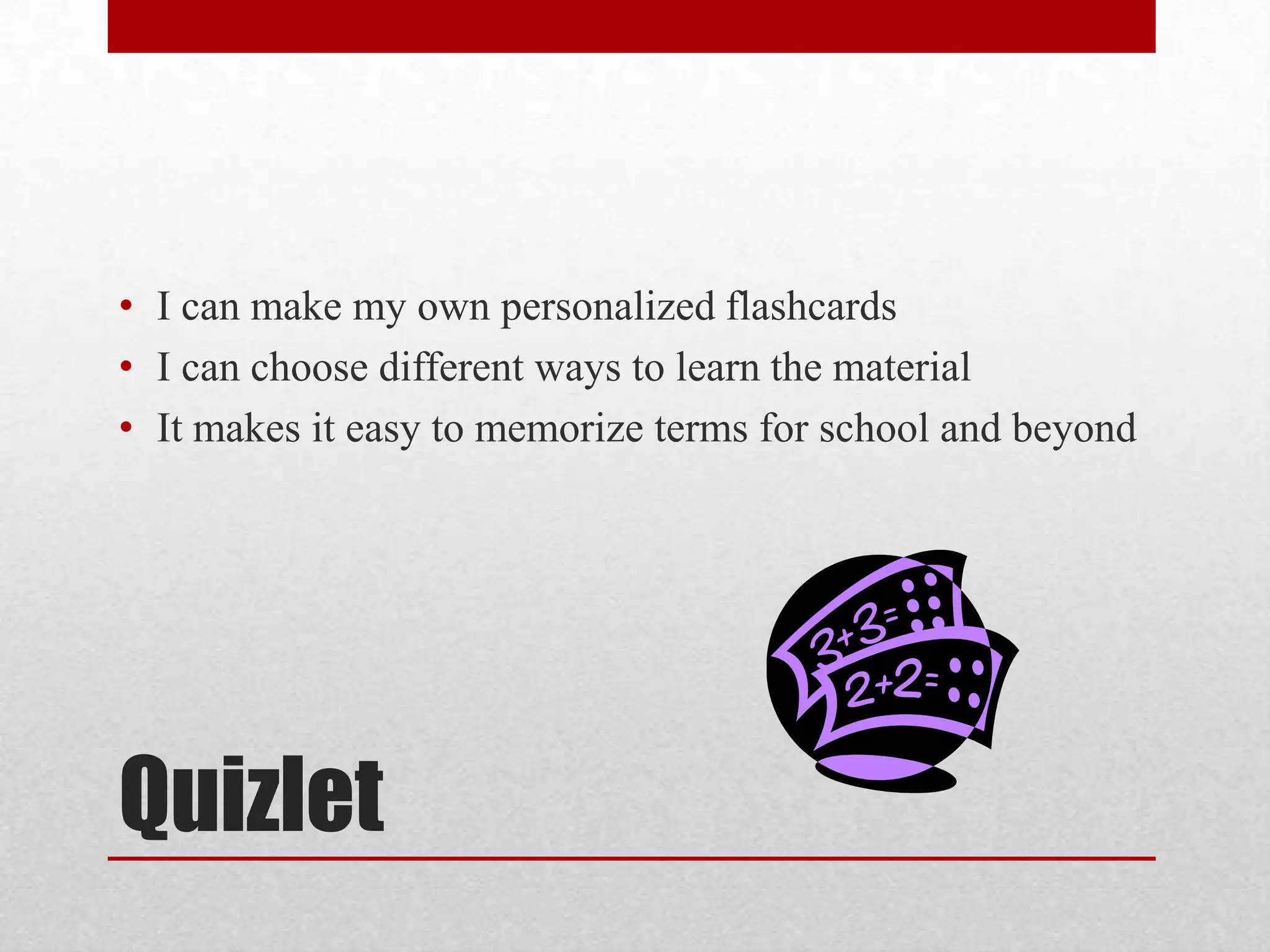 - Quizlet allows creating personalized flashcards for studying terms. Google Maps provides public transit directions and traffic conditions. Wolfram Alpha answers math expressions and searches with examples.
