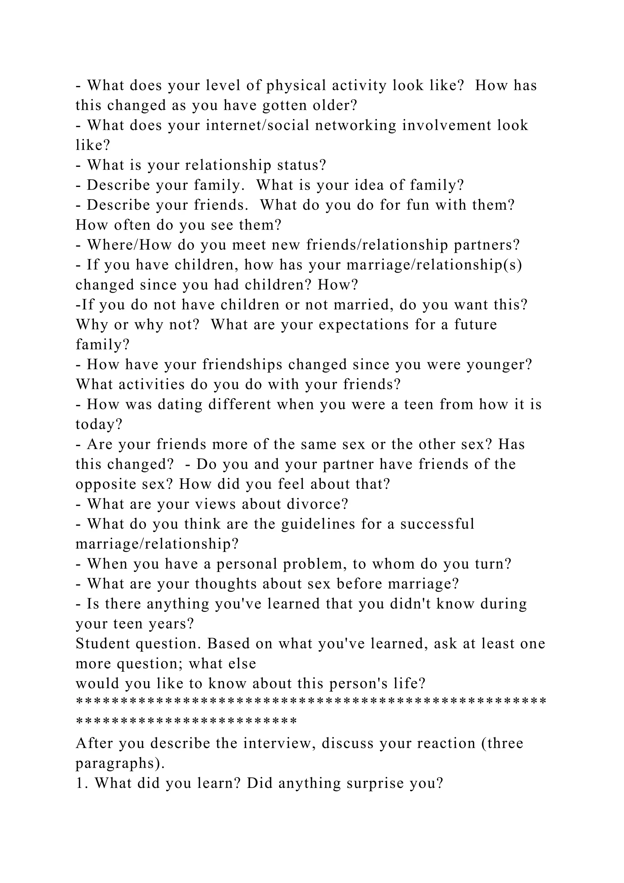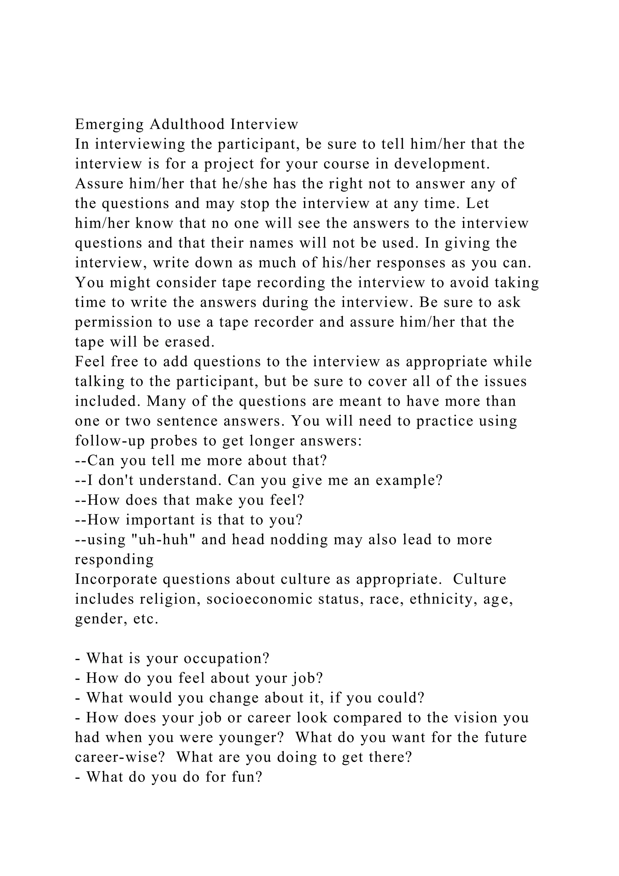 The document provides guidelines for conducting interviews across different stages of adulthood, outlining necessary permissions, cultural considerations, and sample questions for participants. It emphasizes techniques for obtaining detailed responses through follow-up probes and encourages personal reflections after the interviews. Each section includes specific themes related to emerging, middle, and late adulthood, focusing on personal experiences, societal changes, and life lessons.