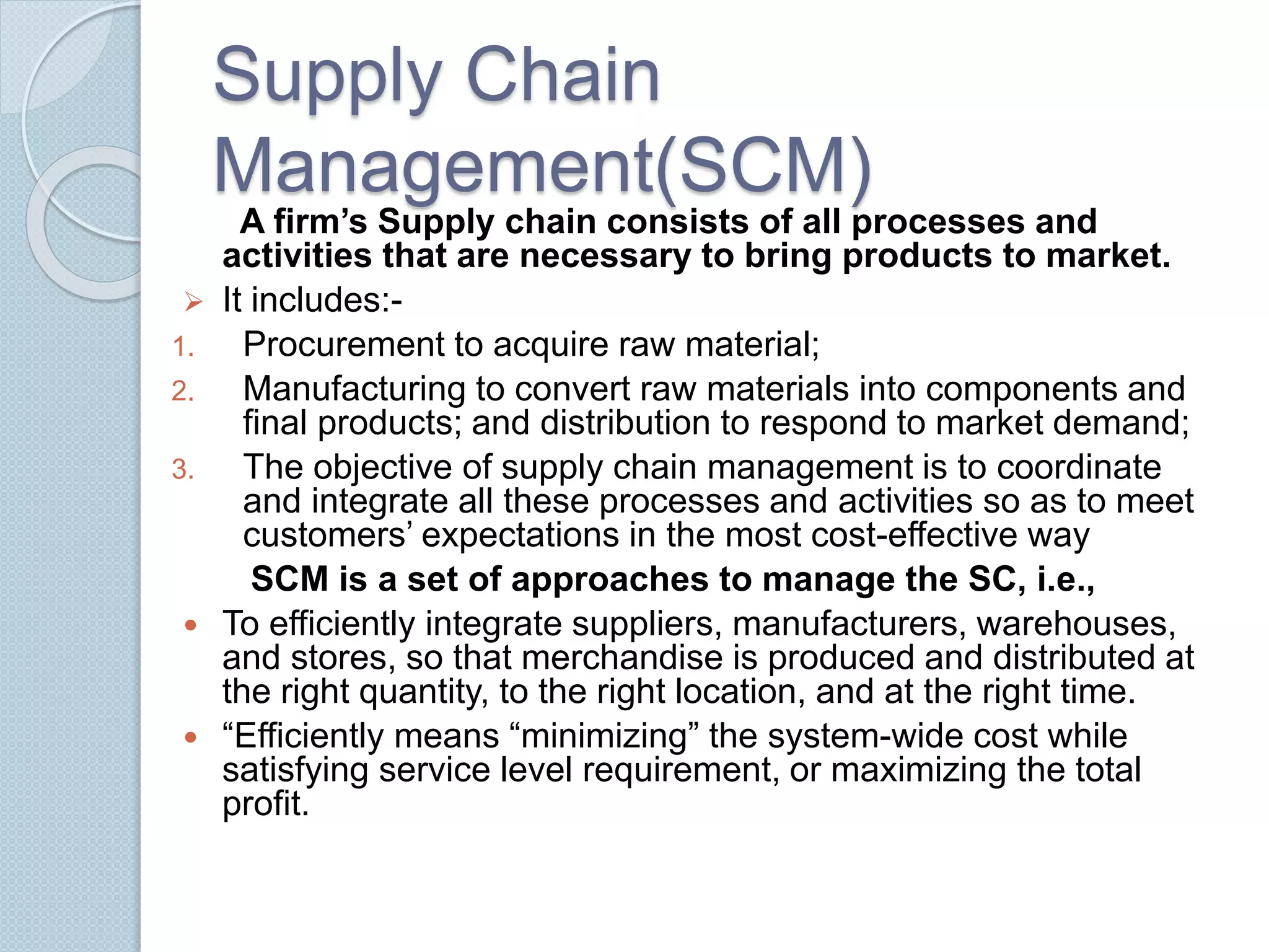 Supply chain management involves coordinating all activities involved in procuring raw materials, manufacturing products, and distributing goods to meet market demand in the most cost-effective way. The objectives of SCM are to efficiently integrate suppliers, manufacturers, warehouses and stores to produce and deliver the right products, to the right locations, at the right time. SCM software, e-supply chains, and other approaches are used to manage supply chain activities and relationships to achieve competitive advantages.