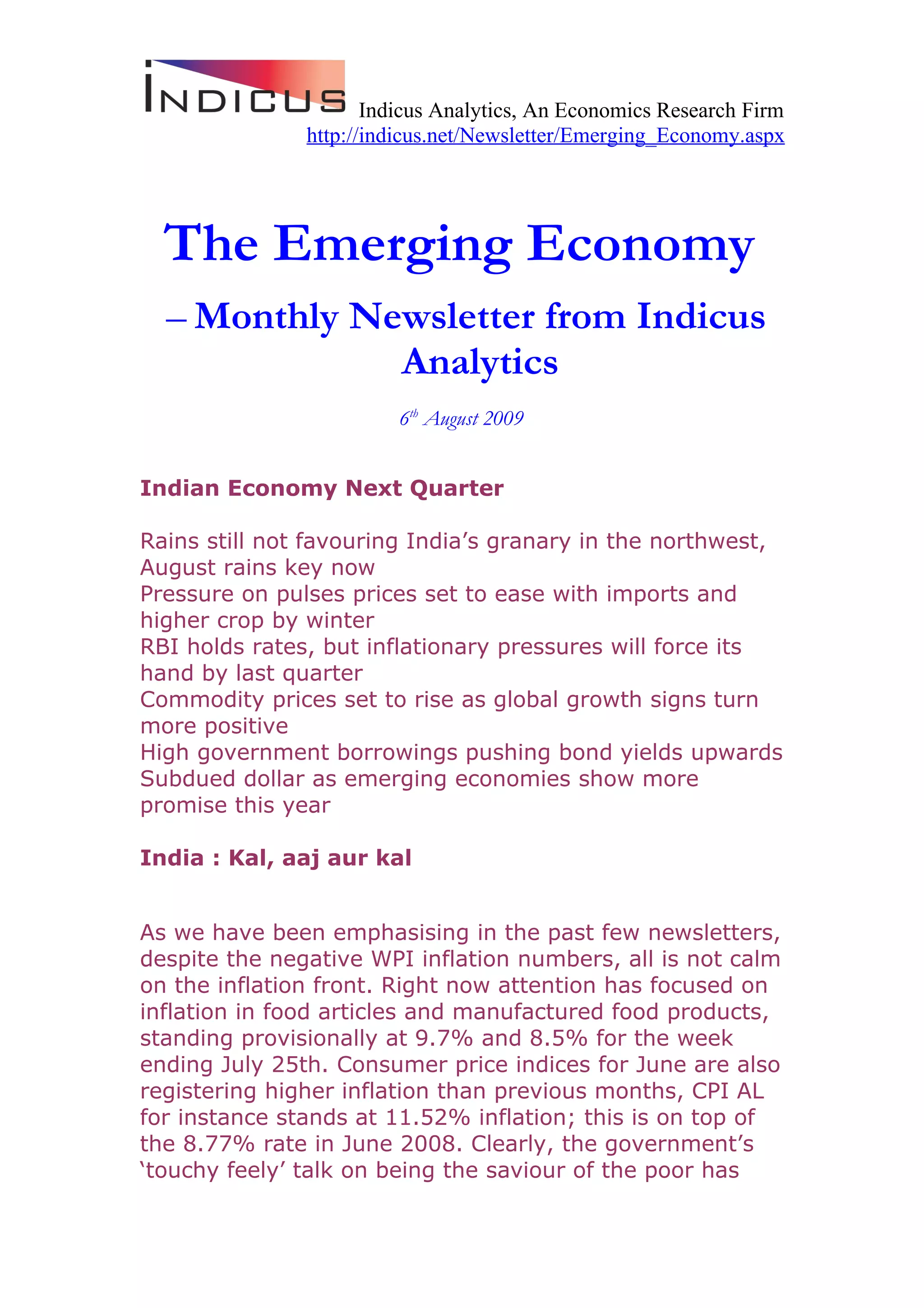 The Indicus Analytics newsletter discusses the Indian economy's challenges, including rising inflation, particularly in food articles, and impacts on pulses due to deficient rain. The RBI's stance on interest rates and high commodity prices amidst global recovery indicates ongoing inflationary pressures. Despite some positive indicators in industrial growth and hiring, significant concerns remain about agricultural production and government fiscal policy effectiveness.