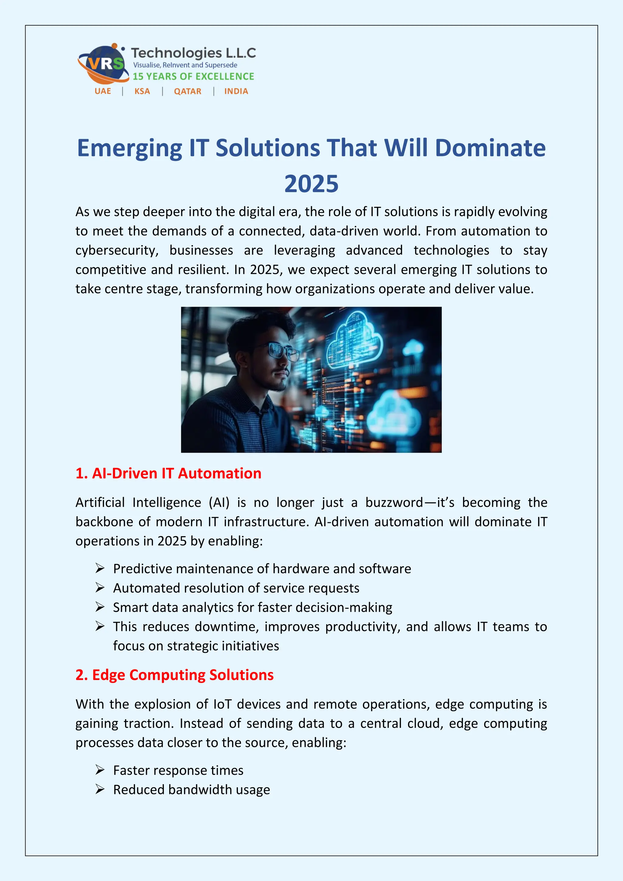 Discover top emerging IT solutions set to transform businesses and tech landscapes in 2025. VRS Technologies LLC offers the best services of IT Solution in Dubai, For more information contact us: +971-56-7029840 Visit us: https://www.vrstech.com/it-solutions-dubai.html