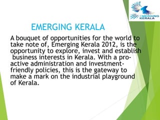 This document summarizes a presentation about Emerging Kerala 2012, an event to promote investment and business opportunities in Kerala, India. The objectives are to highlight Kerala's strengths, position it as an investment hub, and showcase potential sectors. Key sectors highlighted include tourism, healthcare, manufacturing, ports, textiles, electronics and more. Major infrastructure projects like the Kochi Metro, Vizhinjam Seaport and gas pipelines were also summarized. The event will involve participation from government officials, business leaders and trade delegations from India and other countries to explore bilateral cooperation opportunities.