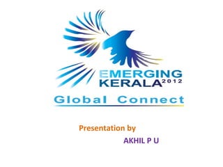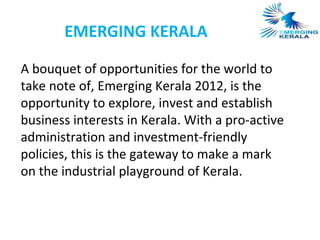 The document summarizes the Emerging Kerala 2012 conference that aims to promote investment and business opportunities in Kerala, India. The conference will showcase 26 sectors including tourism, healthcare, IT, infrastructure projects, and more. Over 2,500 participants from India and abroad including government ministers, business leaders, and diplomatic delegations are expected to attend. Bilateral cooperation opportunities are highlighted between Kerala and countries such as China, Canada, UK, USA, and others. The goal is for Kerala to become a global economic hub through entrepreneurship and equitable socio-economic growth.