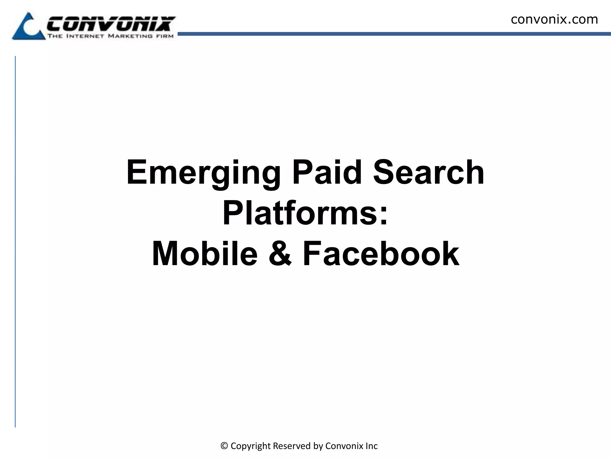 The document discusses the emergence of mobile and Facebook advertising platforms, highlighting trends in mobile advertising due to smartphone adoption, different advertising models, and the unique targeting options available. Facebook ads are emphasized for their demographic targeting capabilities and effectiveness in promoting websites, events, and applications. The document also compares mobile and Facebook ads' strengths and weaknesses, stressing the importance of fresh ad content to maintain user engagement.