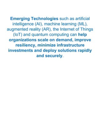 The document discusses a range of emerging technologies, including artificial intelligence, machine learning, blockchain, 5G, and quantum computing, and their impact on organizational scalability and efficiency. It highlights the significance of data science and digital marketing in leveraging these technologies for improved decision-making and increased operational effectiveness. Additionally, it outlines various applications and trends in e-commerce, cybersecurity, and the future of work as influenced by these advancements.