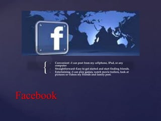 The document discusses emerging technologies including Facebook, Google Translate, Blogger, Gmail, Flickr, Twitter, Delicious, Sumopaint, Digg, and Technorati. Facebook is described as convenient for posting from any device, straightforward to use, and entertaining for games and media. Google Translate allows easy translations on phones and would be useful for travel. Blogger is easy to set up and customize, and recommended for friends who blog. Gmail is checked daily and used to send various file types, conveniently accessed on phones. Flickr securely stores photos privately shared with friends and family. Twitter is disliked for unnecessary sharing of daily activities and celebrity news. Delicious and bookmarks are seen as unnecessary due to Google tracking bookmarks.