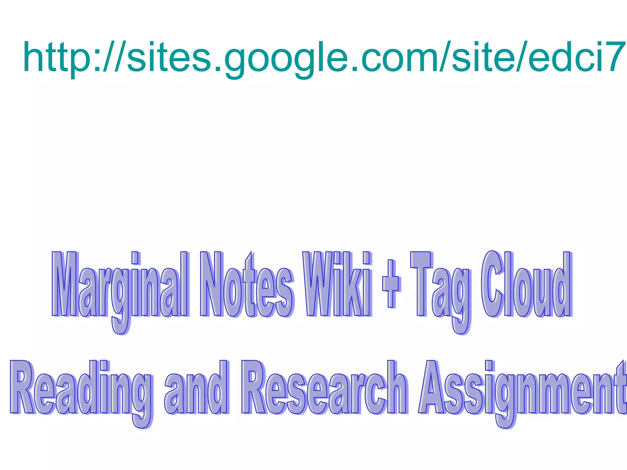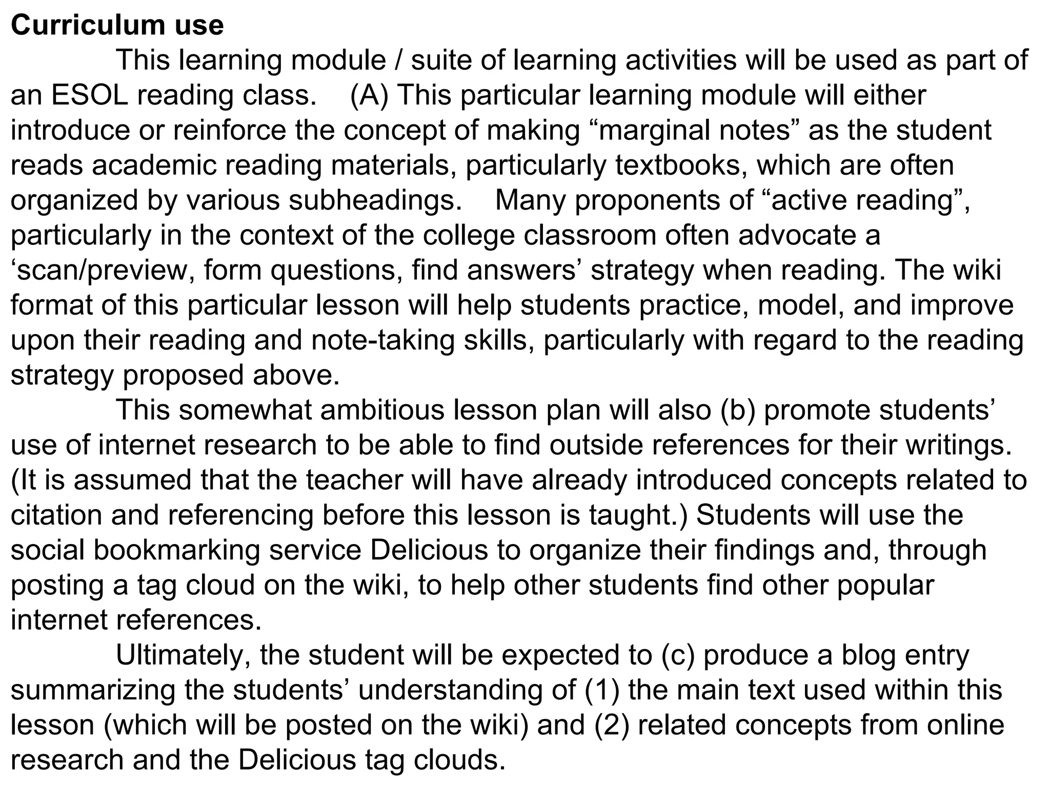 This learning module uses a wiki, Delicious social bookmarking, and student blogs to teach and reinforce active reading skills. Students will practice making marginal notes on texts posted to the wiki. They will then use Delicious to organize their internet research on the topics and create a tag cloud to help other students find resources. Finally, students will summarize on their blogs what they learned from the original text and their additional research. The goals are for students to demonstrate active reading, conduct research, and reflect on their learning through blogging. The teacher will set up the wiki and demonstrate the web tools, and then assess students on their note taking, research, summarizing abilities, and technology skills.