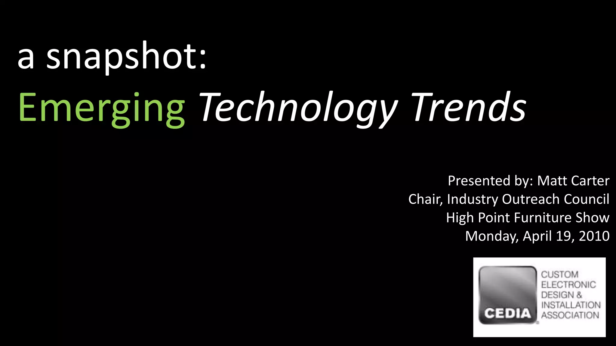 Matt Carter, Chair of the Industry Outreach Council for the High Point Furniture Show, presented emerging technology trends to identify the current market paradigm, share trends, and discuss near future consumer adoption. Some of the top trends discussed included integration and interconnectivity of systems in simple and valuable ways. Other trends were using imagination in design and transparency in technology that only appears when needed. Additional trends focused on entertainment, sustainability, aging in place, and productivity. Carter emphasized that technology professionals hold the key to delivering innovative solutions and tools through new ideas and creative influences to consumers.