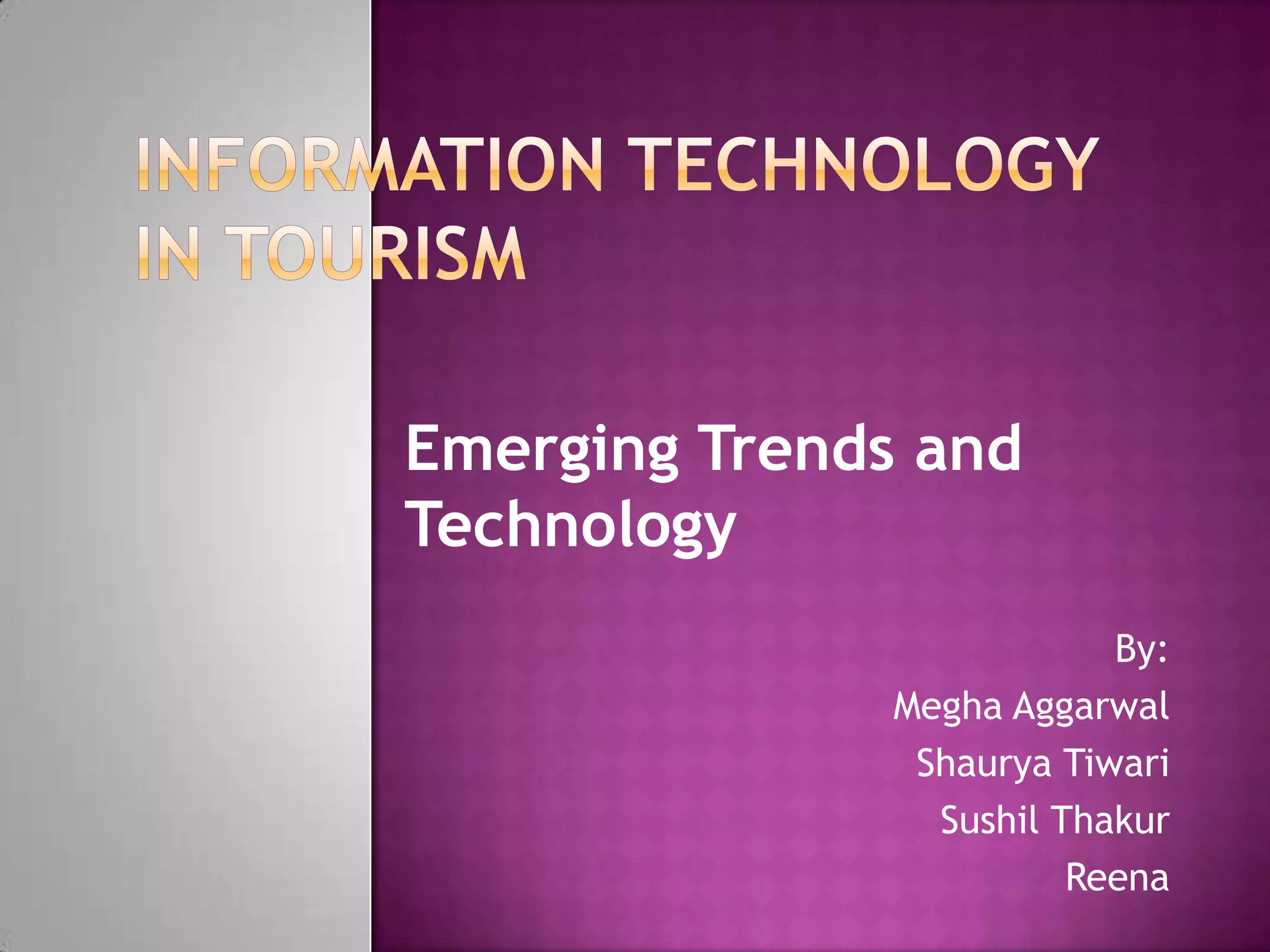 The document discusses emerging trends in electronic payment systems (EPS) and technologies facilitating online transactions, including methods like e-cash, e-wallets, smart cards, and internet banking. It also covers the applications of virtual reality in various sectors such as business, healthcare, and tourism, highlighting its role in training and enhancing user experience. Lastly, it touches on the concept of couch surfing as a means of cultural exchange and personal storytelling through blogs, particularly in the travel and tourism sector.