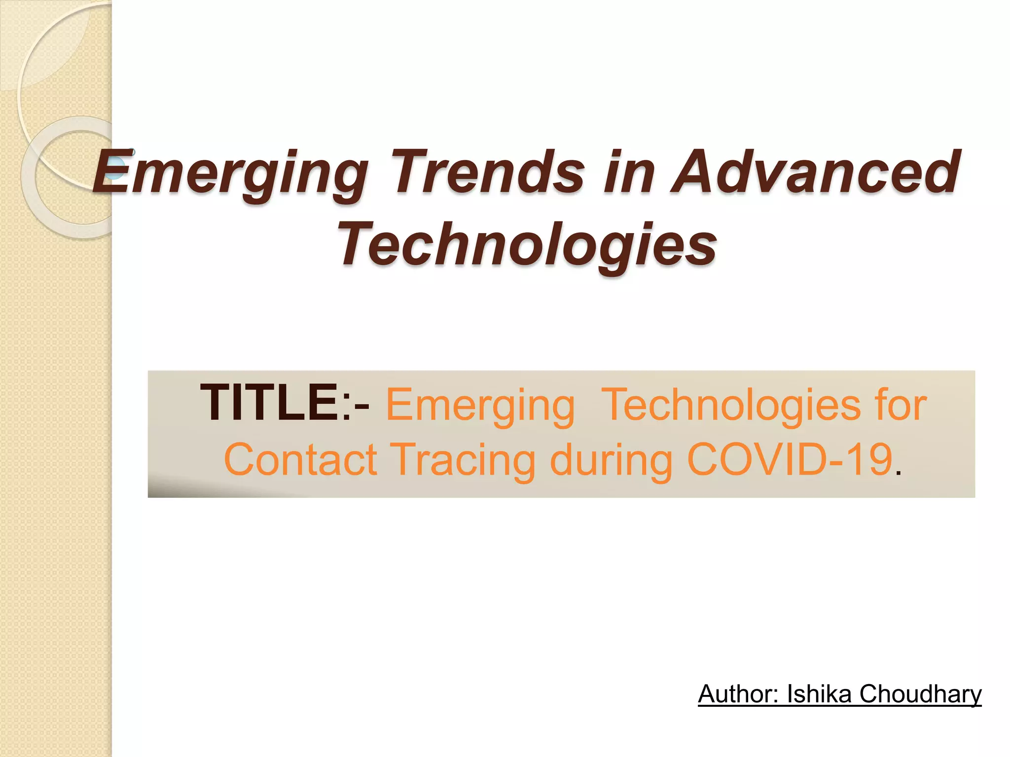 This document discusses emerging technologies for contact tracing during the COVID-19 pandemic. It describes how contact tracing was used historically to control outbreaks like Ebola and help eradicate smallpox. Technologies now being used and developed for COVID-19 contact tracing include mobile apps to track infections using Bluetooth and GPS and notify people of potential exposures. Challenges with contact tracing COVID-19 include asymptomatic spread and reliance on testing availability. The future of contact tracing technologies may involve using data from mobile apps to inform policy as lockdowns are lifted.
