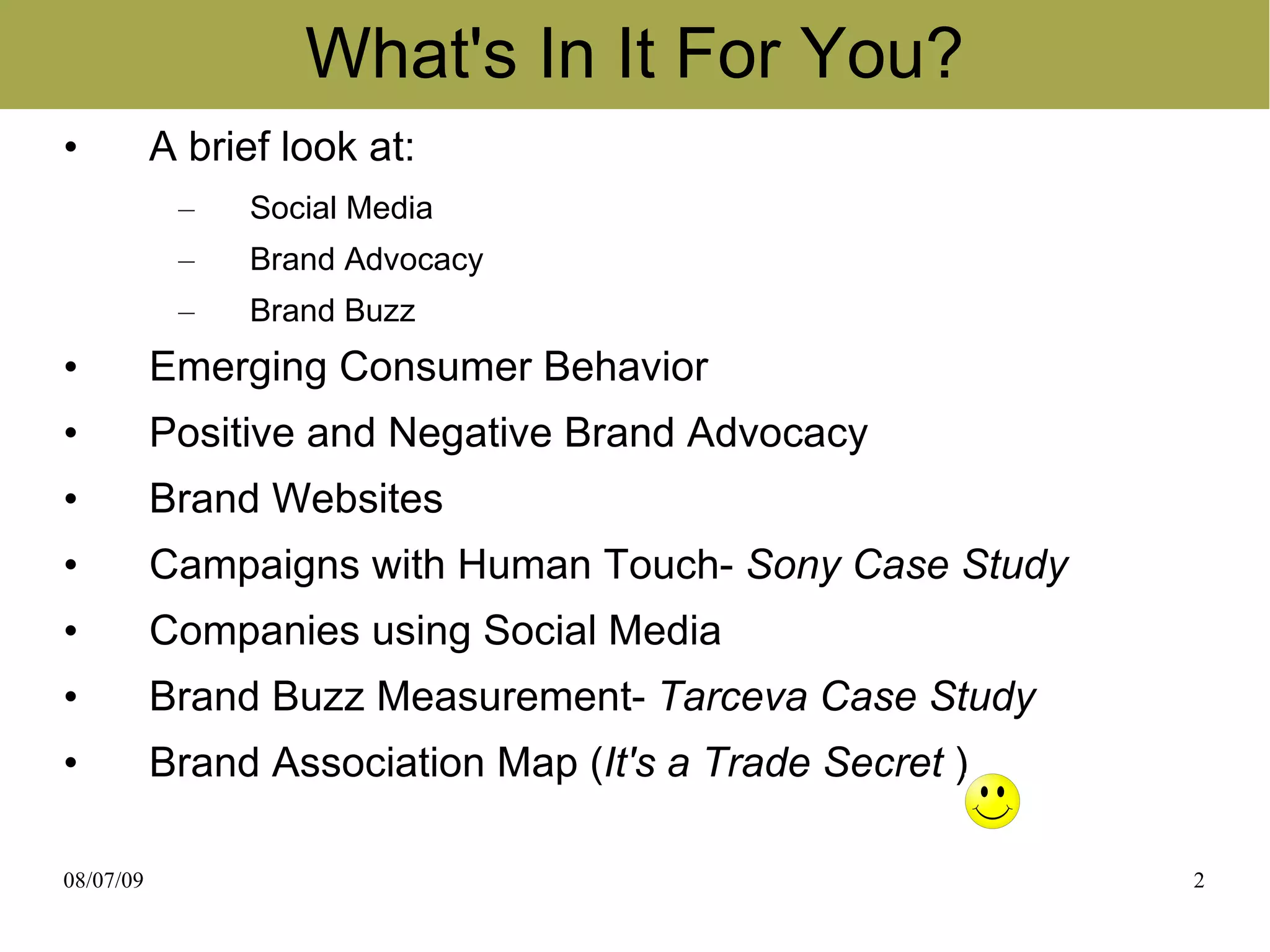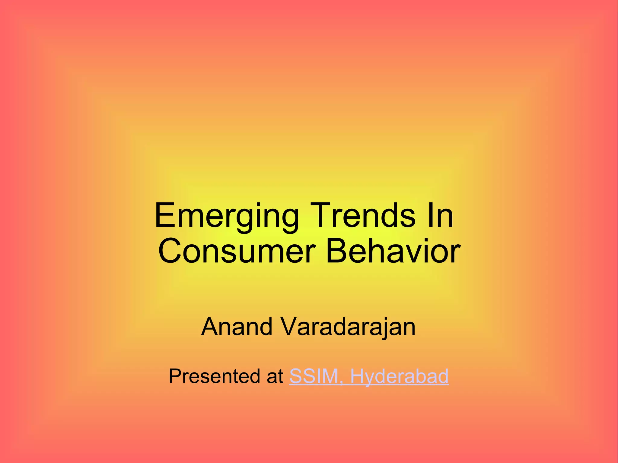 The document discusses emerging trends in consumer behavior, emphasizing the influence of social media, brand advocacy, and consumer empowerment in modern marketing. It highlights characteristics of today's consumers, such as their desire for control, convenience, and engagement, while showcasing case studies of brand campaigns that successfully utilized these trends. The importance of generating brand buzz through consumer-generated content and effective online communication is also emphasized as essential for breaking through the clutter of commercial messages.