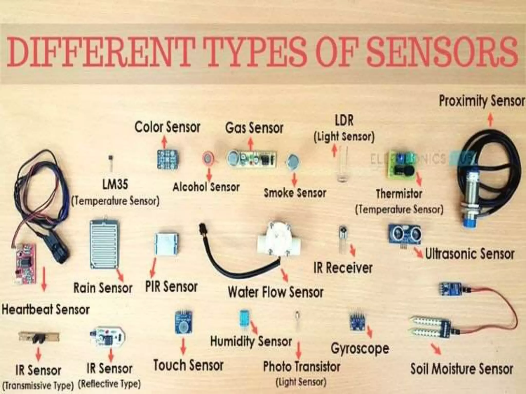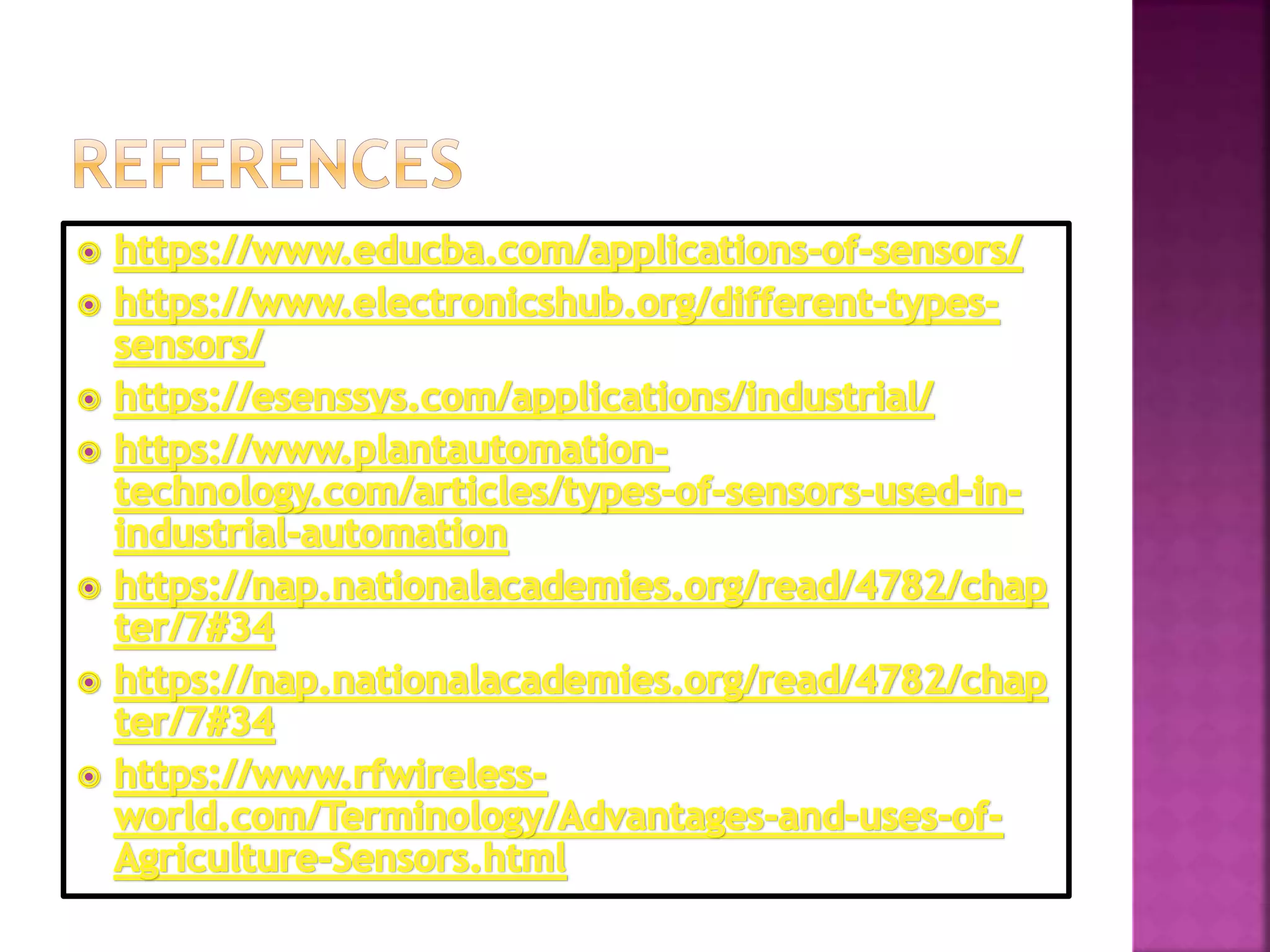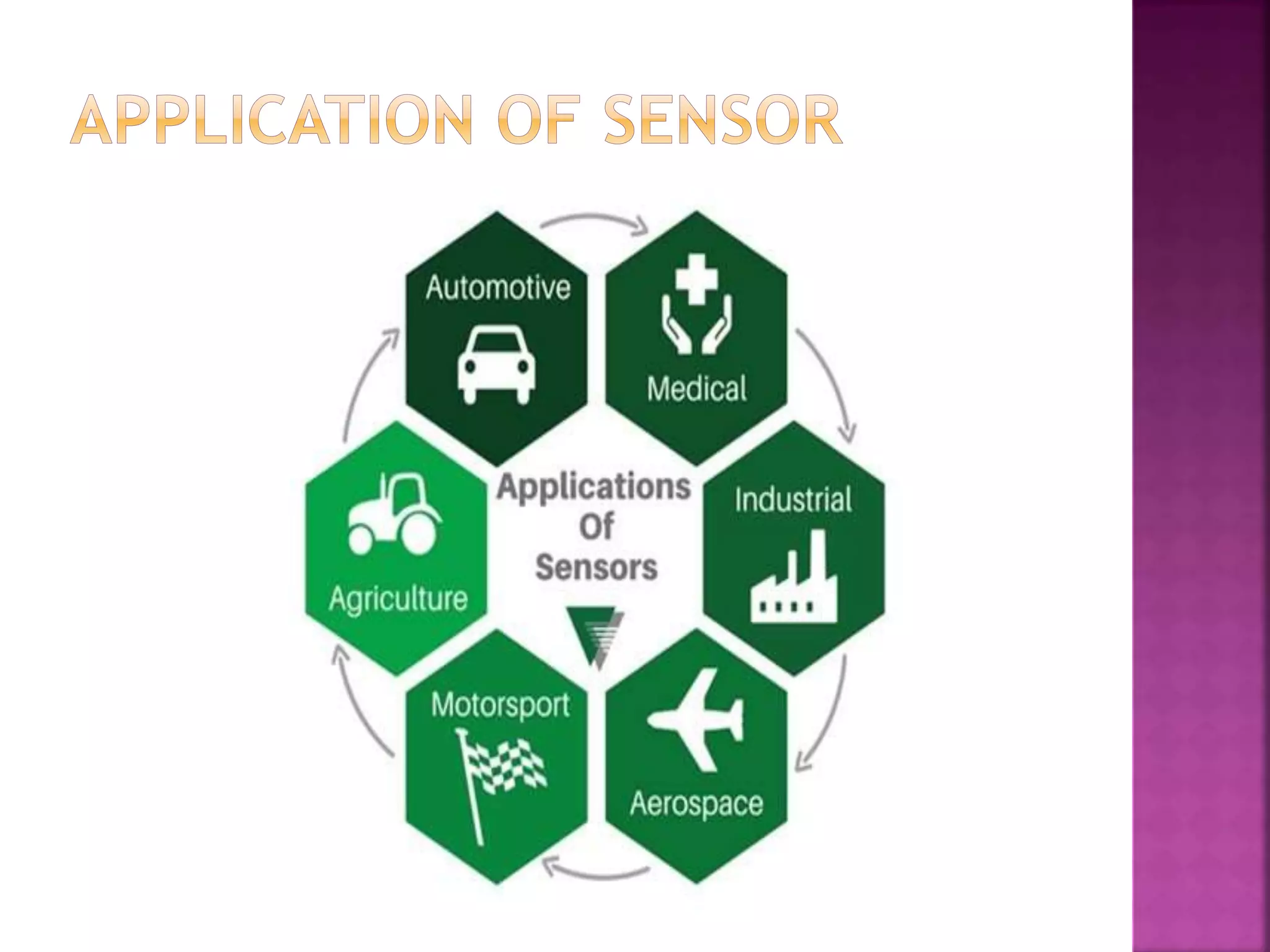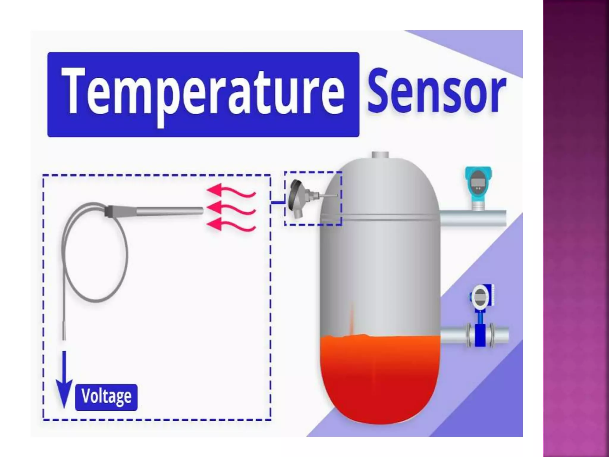 The document discusses sensors and temperature sensors. It defines a sensor as a device that detects and responds to physical input from the environment and converts it into a readable signal. It then discusses different types of temperature sensors like thermocouples, thermistors, and RTDs that detect temperature changes by measuring properties like voltage, resistance, or current. Finally, it provides examples of infrared temperature sensors and optical pyrometers that can measure the temperature of moving or hot objects non-contactly and discusses common temperature sensor uses.