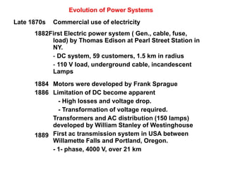 The document discusses the evolution of electric power systems from the late 19th century to the present. Key developments include the shift from DC to AC systems in the late 1880s, increasing transmission voltages from the early 1900s to the 1990s, and the development of HVDC transmission in the 1950s to overcome limitations of HVAC systems. It also summarizes the present state of the Indian power system and projected scenarios by 2012 with increasing installed capacity, demand, and the need for stronger inter-regional transmission networks. Emerging transmission technologies discussed include UHVAC, gas insulated lines, HVDC-Light, and FACTS devices.