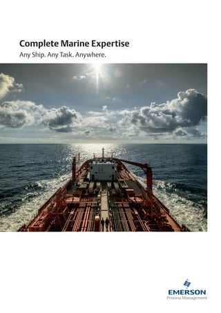 This document summarizes Emerson's marine expertise and solutions for vessel operations. It describes integrated control and monitoring systems that provide vessel oversight, valve remote control systems, fuel management systems for optimized fuel usage, tank level gauging for cargo tanks, and cargo monitoring systems. Emerson aims to help vessels operate safely, efficiently and with maximum uptime through customizable automation and monitoring solutions.