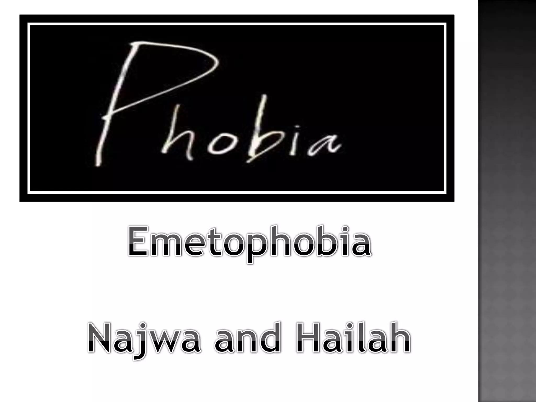 Emetophobia is an extreme and irrational fear of vomiting. The presentation discusses the causes of emetophobia, which can stem from childhood experiences or anxiety in adults. Those with emetophobia often develop anorexia due to their fear of vomiting, and it significantly impacts their quality of life. The presentation reviews treatments for emetophobia including medication and exposure therapy to help patients overcome their phobia. It concludes with a question and answer session to discuss emetophobia in more detail.