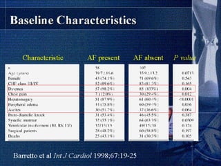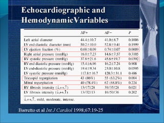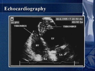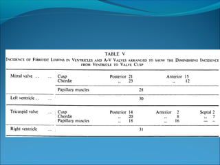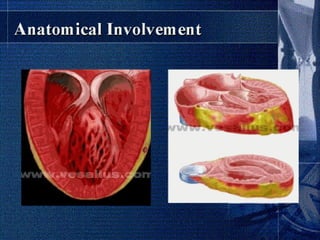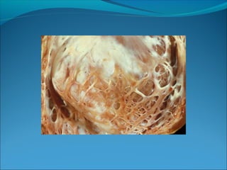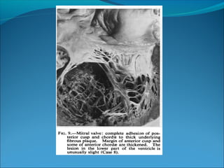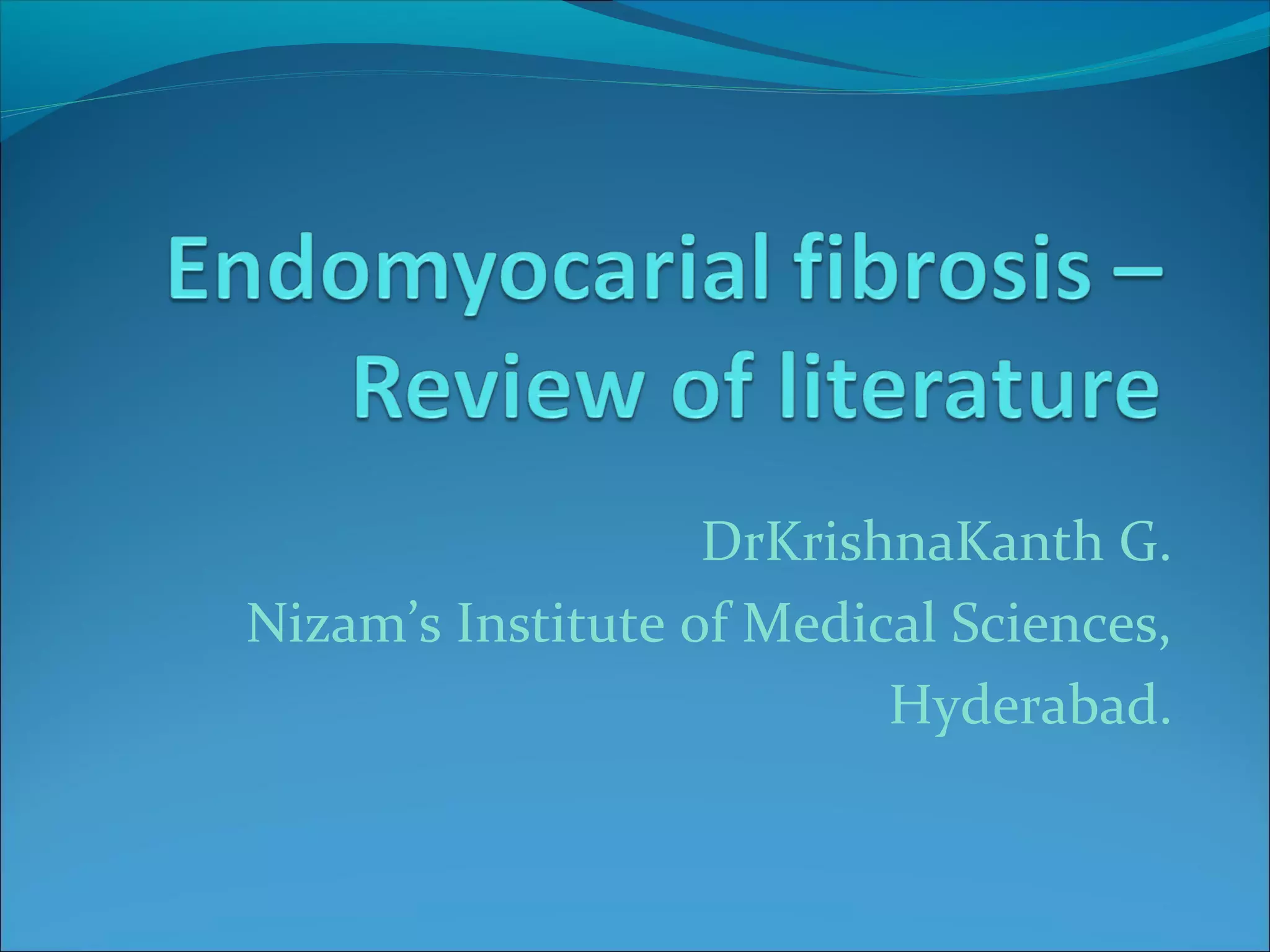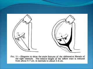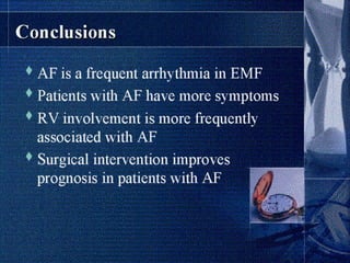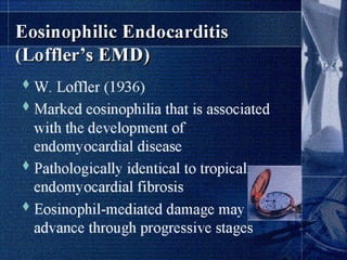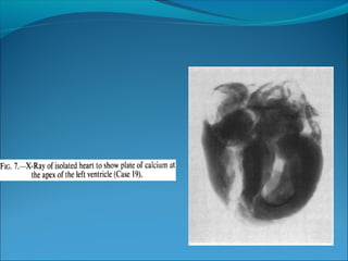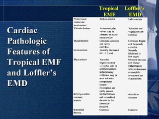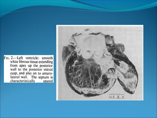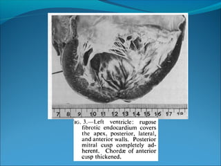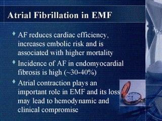 Endomyocardial fibrosis (EMF) is a disease characterized by fibrosis of the heart muscle lining. It most commonly affects children and young adults in tropical regions. The disease involves thickening and scarring of the endocardium that can obstruct the heart chambers and valves. Symptoms depend on which chambers are affected but may include heart failure signs like edema, ascites, and elevated jugular pressure. EMF has an uncertain cause but is associated with malnutrition, high cassava diet, and eosinophilia in some cases. Definitive diagnosis relies on endomyocardial biopsy showing fibrosis.