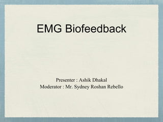 EMG biofeedback involves using equipment to accurately measure and provide visual or auditory feedback of electromyography (EMG) signals to help patients learn voluntary control of muscle activity. It has various clinical applications such as neuromuscular rehabilitation, chronic pain management, and treatment of conditions like stroke, cerebral palsy, and incontinence. EMG biofeedback works based on motor learning principles and involves setting thresholds and targets for patients to achieve. Several studies have found EMG biofeedback to be effective in improving muscle strength, relaxation, gait, and balance in patients with injuries or neurological conditions.