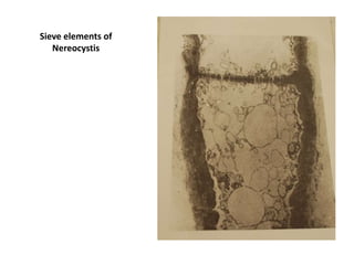 This document contains diagrams and electron micrographs of various algal cells and their organelles. It describes features of cryptophyte ejectosomes, dinoflagellate nuclei, euglenophyte eyespots, and chloroplast structures across different algal groups. Specifically, it notes that cryptophyte ejectosomes line cell walls and parts can be seen beneath the cell membrane. Dinoflagellate nuclei contain large nucleoli and permanently condensed chromosomes. Euglenophyte eyespots are composed of globules outside the chloroplast near the flagellar swelling. Chloroplasts are described across haptophytes, chrysophytes, and euglenophytes showing similarities in thylakoid stacking and membrane structures.