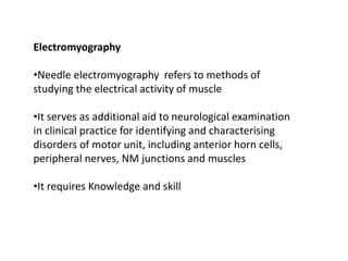 This document provides an overview of electromyography (EMG) techniques and normal EMG findings. It describes how EMG is used to study electrical activity in muscles to aid in neurological examination. It explains the motor unit, action potential generation, different electrode types, equipment, procedures, and normal EMG findings like insertional activity, end plate noise and spikes, fibrillation and fasciculation potentials, and motor unit action potentials. Precautions for the procedure and factors that can influence EMG readings are also summarized.