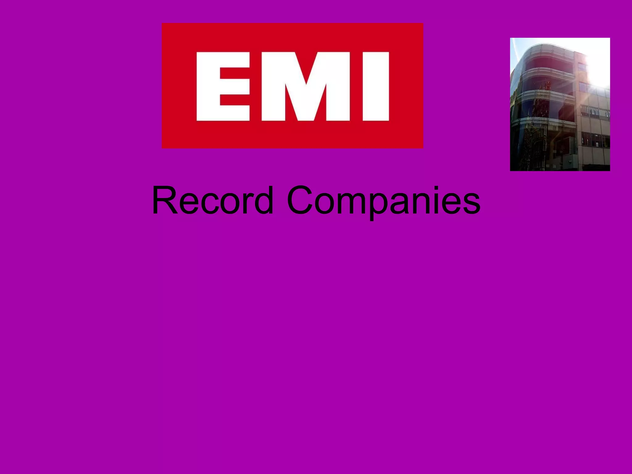 The document discusses the structure and operations of EMI, a major record company. It describes EMI's departments that are responsible for marketing catalog and budget releases through compilation albums and greatest hits. It also outlines EMI's marketing department which licenses artists' music and negotiates deals for TV, film, radio and promotions. Finally, it mentions that the banking giant Citigroup took ownership of EMI after the private equity firm Terra Firma was unable to keep up with loan payments following its acquisition of the company.