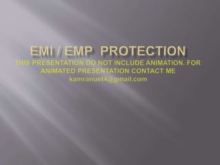 The document discusses electromagnetic interference (EMI), electromagnetic pulse (EMP), and electromagnetic compatibility (EMC), detailing their definitions, sources, effects on electronic equipment, and applicable military standards for protection. It outlines preventive measures, including shielding techniques, surge protection, and specific military standards for C4I facilities. The document provides various options for shielding and power supply integrity during such electromagnetic events and the associated advantages and disadvantages of each method.