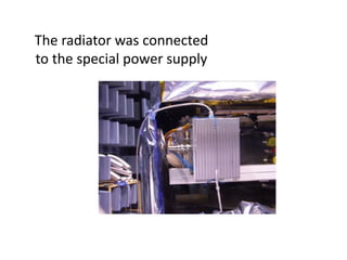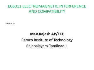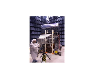 This document provides information about electromagnetic interference (EMI) and electromagnetic compatibility (EMC) testing. It describes typical EMC test facilities like semi-anechoic chambers and shield rooms. It also outlines various EMC tests including radiated emission testing, conducted emission testing, radiated susceptibility testing, conducted susceptibility testing, and electrostatic discharge testing. Standards and procedures for performing these tests are discussed. The goal of EMC testing is to ensure electronic systems do not interfere with other systems and continue operating correctly despite electromagnetic interference.