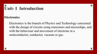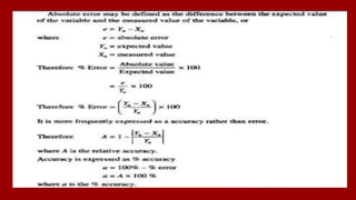 This document provides an overview of electronic measurements and instrumentation. It discusses key topics like electronics, measurement processes, instruments, transducers, and performance characteristics of measuring systems. The performance characteristics include static characteristics like accuracy, precision, resolution, and dynamic characteristics like speed of response, fidelity, and lag. Common types of errors in measurement like gross errors, systematic errors and random errors are explained. Statistical analysis methods for random errors are described. Finally, the document discusses the basic meter movement in permanent magnetic moving coil instruments and the D'Arsonval galvanometer mechanism.