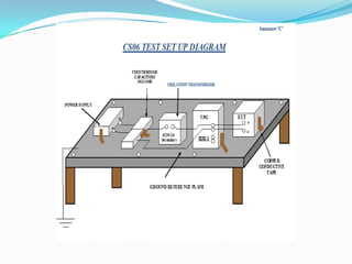 The document summarizes environmental testing performed on electrical equipment at an environmental test facility. Various labs are described that can simulate environmental conditions like vibration, shock, climate, and EMI/EMC. Specific dynamic and vibration test equipment are listed, as well as climatic chambers, a thermal shock chamber, and vacuum equipment. EMI/EMC testing procedures are discussed including radiated emission, conducted susceptibility, and radiated susceptibility tests. The document provides an analysis of EMI/EMC testing performed on an electrical unit to verify its reliability and compliance with standards.