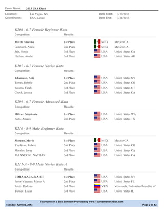 This document summarizes the results of the 2013 USA Open karate tournament held in Las Vegas, Nevada from March 30-31, 2013. It lists the top three placing competitors in each kata division for various age groups and belt levels, including their name, country of origin, and place won. The tournament was coordinated by USA Karate and included over 200 competitors across 18 kata divisions for youth and adults.