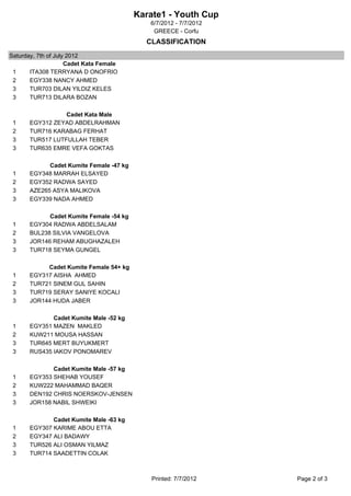 The document provides results from the Karate1 - Youth Cup competition held from June 6-7, 2012 in Corfu, Greece. It lists winners and placement for various age group/gender kata and kumite categories for both junior and cadet divisions over the two day event. Weight classes and countries of origin are included for hundreds of competitors across 30+ events.