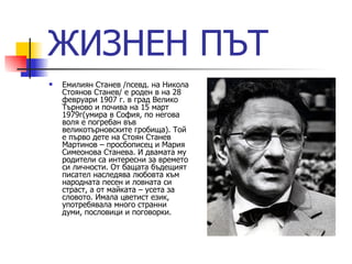 ЖИЗНЕН ПЪТ ЕмилиянСтанев /псевд. на Никола Стоянов Станев/ е роден в на 28 февруари 1907 г. в град Велико Търново и почива на 15 март 1979г ( умира в София, по негова воля е погребан във великотърновските гробища ) . Той е първо дете на Стоян Станев Мартинов – просбописец и Мария Симеонова Станева. И двамата му родители са интересни за времето си личности. От бащата бъдещият писател наследява любовта към народната песен и ловната си страст, а от майката – усета за словото. Имала цветист език, употребявала много странни думи, пословици и поговорки.