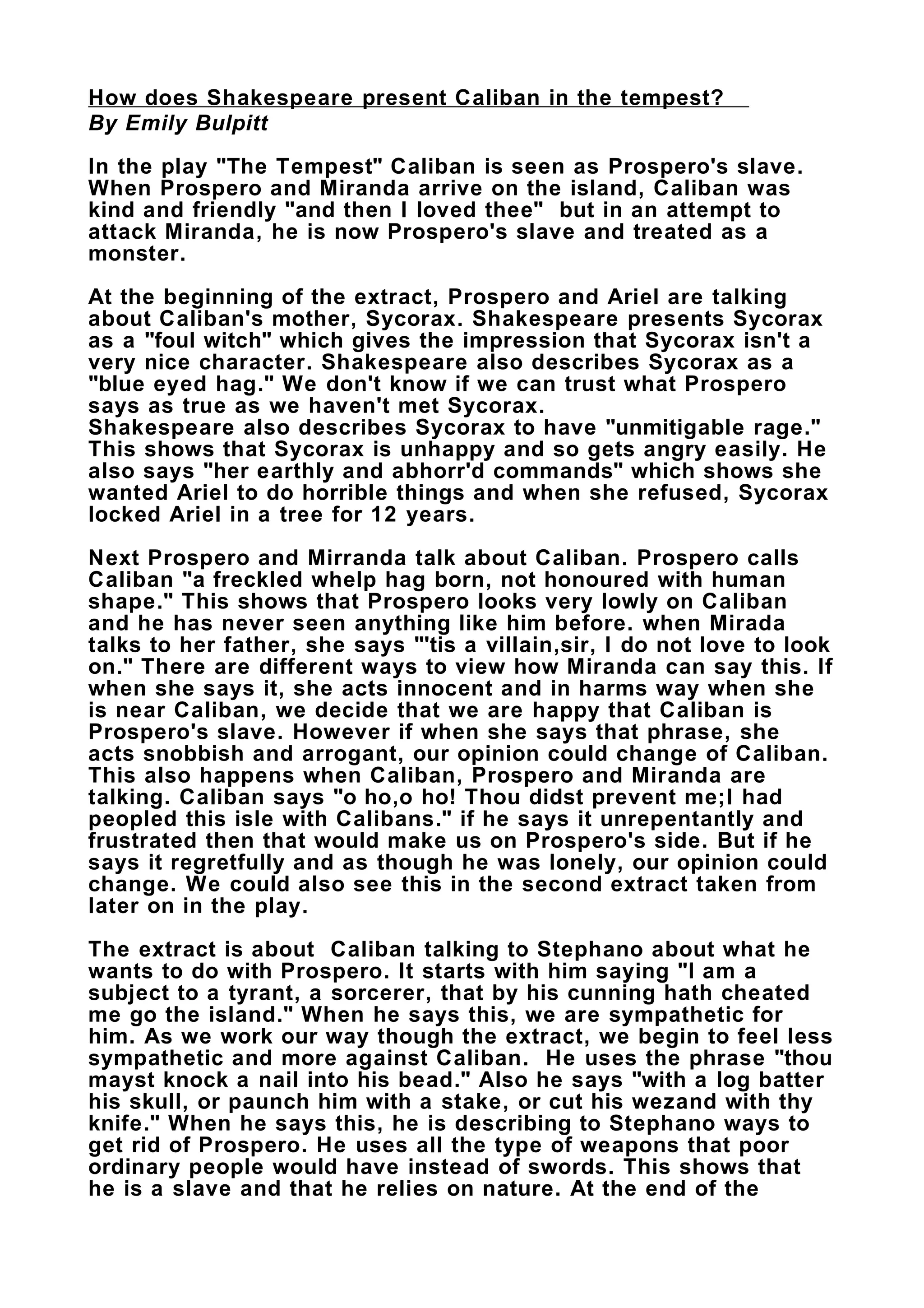 1) Caliban is initially presented kindly by Prospero, but after attempting to assault Miranda, is made Prospero's slave and seen as a monster.