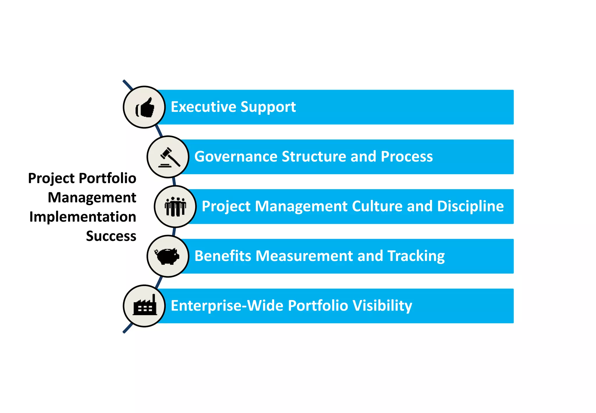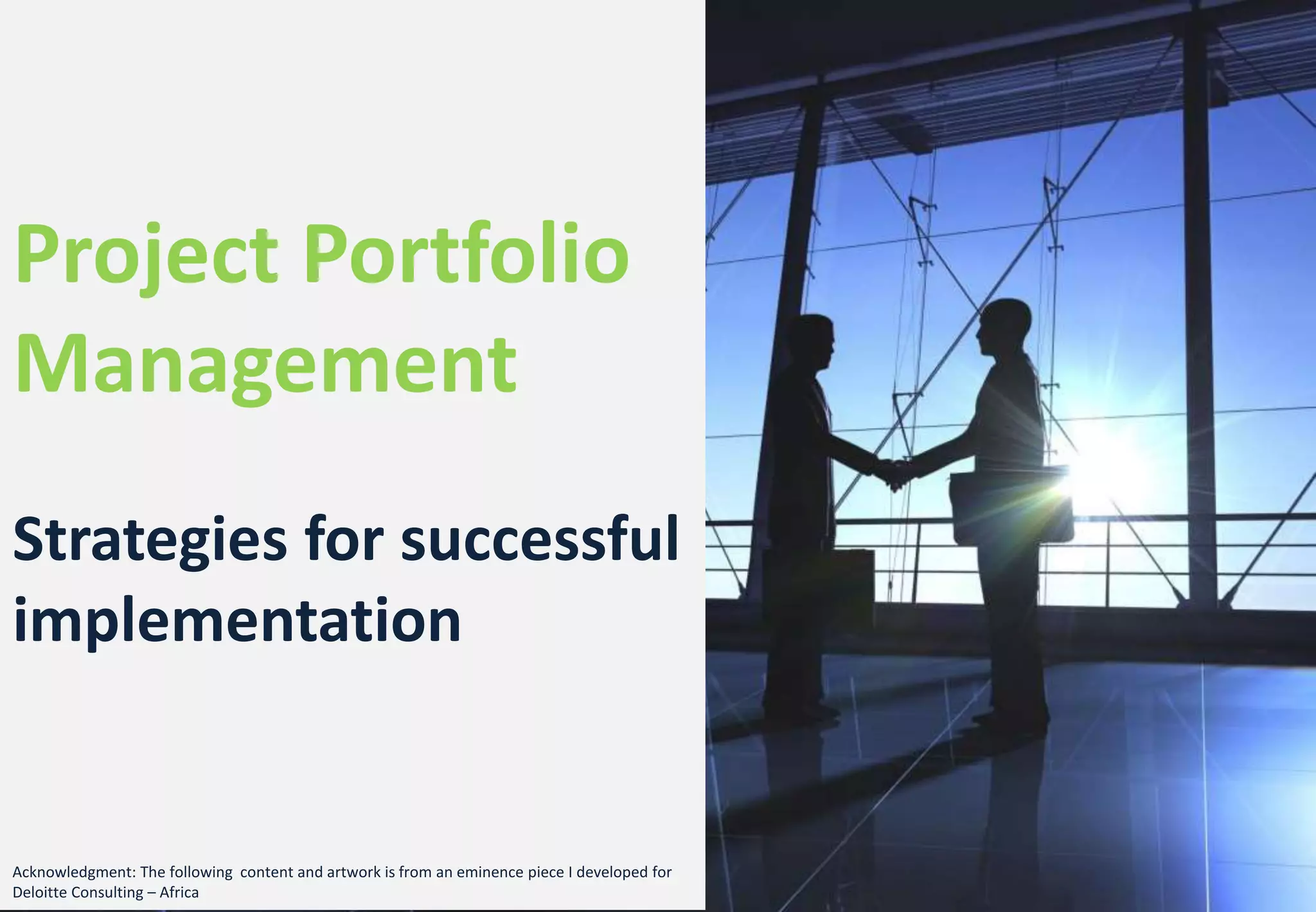 Project portfolio management implementation requires executive support, governance structures, and a project management culture. Key challenges include lack of executive sponsorship, absence of governance processes for strategy translation and project selection, and lack of project management discipline. Successful strategies include ensuring executive support, establishing governance structures and processes for strategic alignment, instilling a project management culture, measuring and tracking benefits, and starting small by focusing on critical initiatives in one business unit.