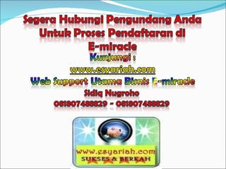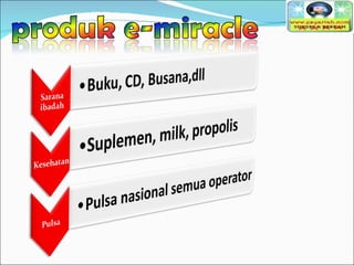 Dokumen tersebut merangkum program bisnis jaringan pemasaran multi level bernama e-miracle yang menawarkan berbagai bonus dan insentif bagi para anggotanya. Program tersebut terdiri dari Program Reguler dan Program Fastrack yang memberikan kesempatan menghasilkan penghasilan tambahan melalui rekrutmen anggota baru dan penjualan produk.