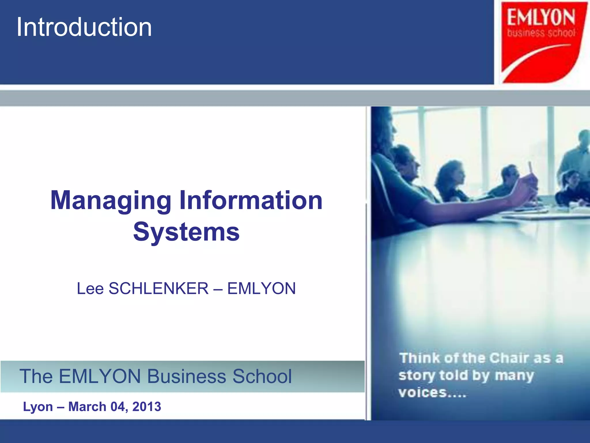 The document provides an introduction to managing information systems. It includes sections on defining an information system, the objectives of an IS, different perspectives of an IS including the financial, logistics, client, and community. It also discusses the role of IT in innovation, the definition of information, structured vs unstructured data, and the objectives of studying information systems. Facilitators of the course are also listed.