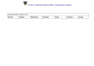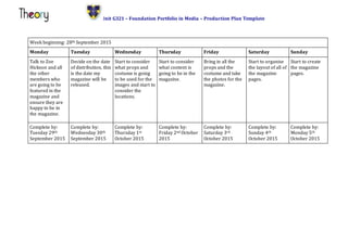 The document is a production plan template for a magazine to be released every two weeks. It outlines the schedule for the first issue to be released on October 11th, including tasks such as confirming participants, planning photoshoots, designing pages, and conducting an interview by certain dates. It also discusses choosing October 11th as the release date to coincide with the start of fall, and partnering with Frontline distribution to distribute the magazine widely.
