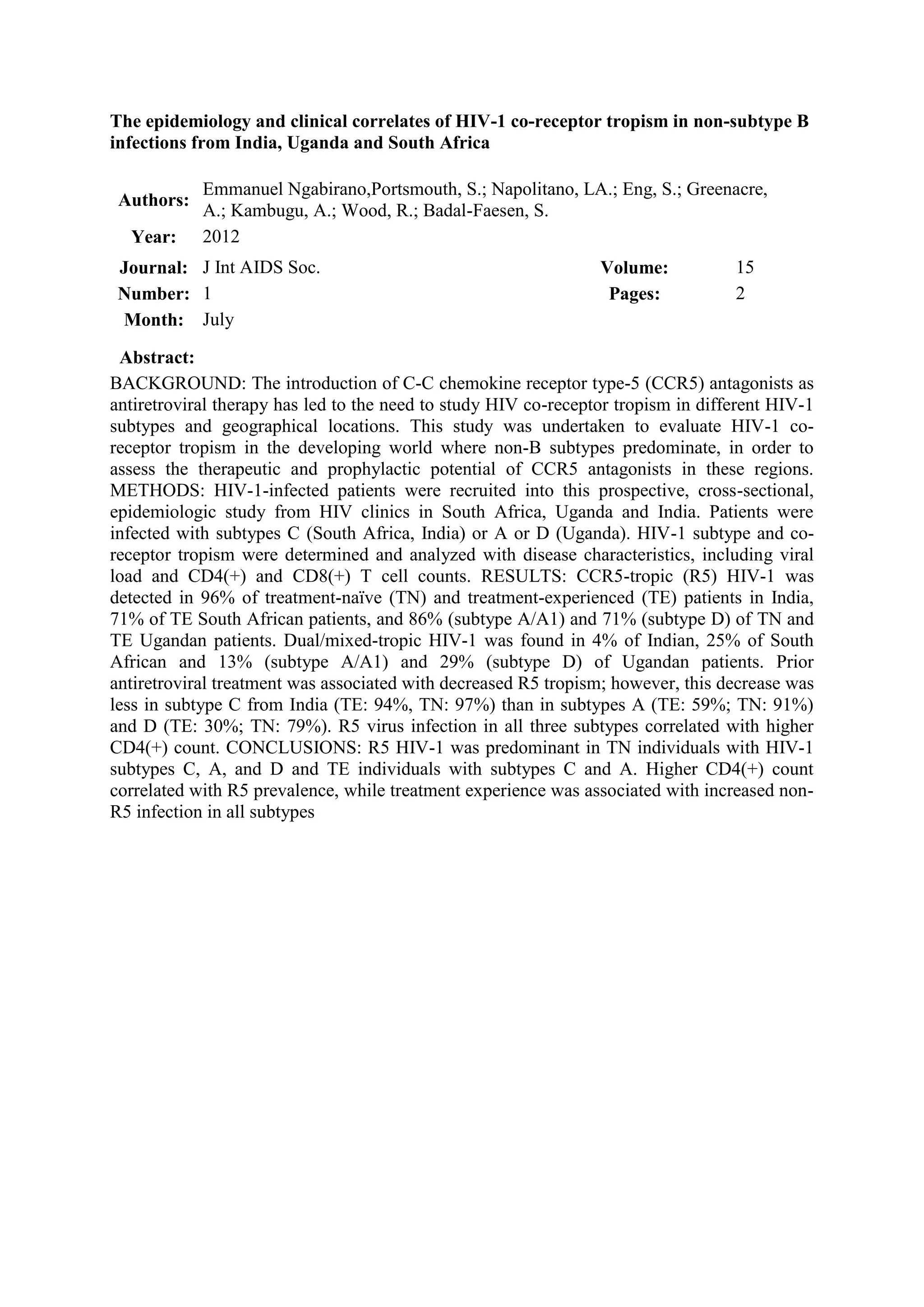 R5-tropic HIV-1 was detected in 96% of treatment-naive and treatment-experienced patients in India with subtype C infections, 71% of treatment-experienced South African patients with subtype C, and 86% and 71% of treatment-naive and treatment-experienced Ugandan patients with subtypes A/A1 and D, respectively. Prior antiretroviral treatment was associated with decreased R5 tropism across subtypes, though to a lesser extent in subtype C from India. R5 virus infection in subtypes C, A, and D correlated with higher CD4+ T cell counts.