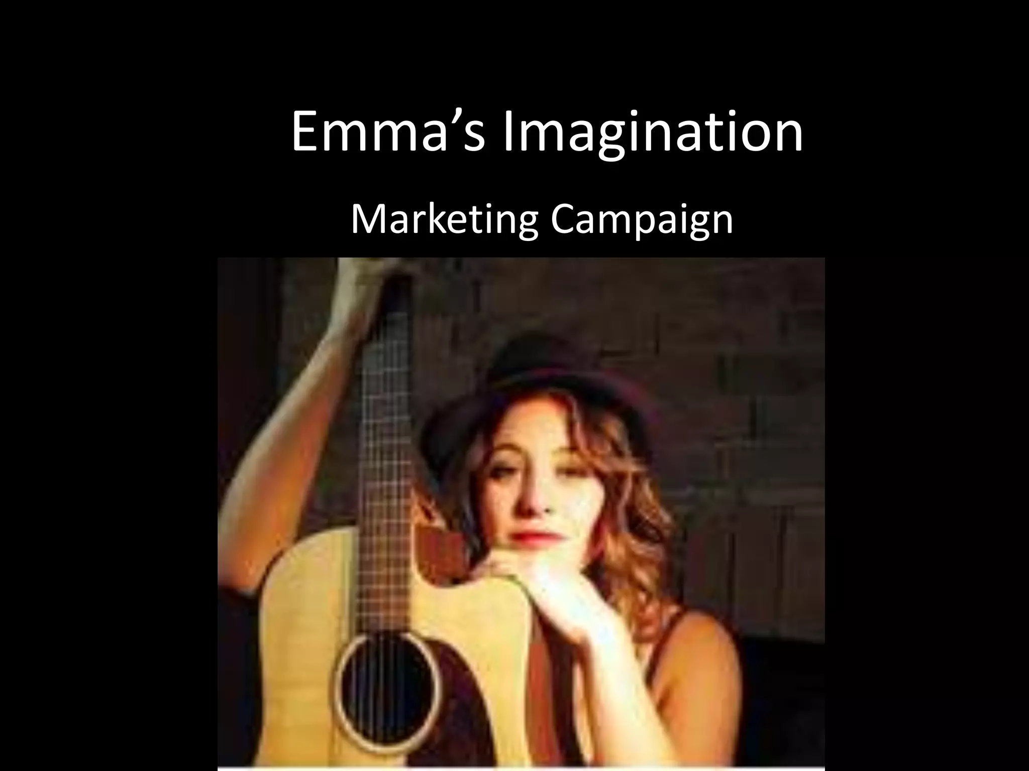This document outlines a marketing campaign for a new musical artist named Emma. It describes her persona as countryside/folk and ethereal. Her style is simple, pretty colors and patterns like lace and floral dresses. Her primary audience is late teen and young adult females who engage with media like Facebook and music magazines. A secondary audience is females in their 30s-40s of diverse ethnicities. Publicity strategies include performing lots of live gigs at bars and clubs in London to build her profile.