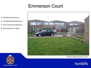 This document provides details about the refurbishment of Emmerson Court, a housing development containing 42 apartments. The refurbishment work will begin in May 2015 and take 41 weeks to complete. The project will upgrade the apartments and communal areas, including adding a buggy store, hair/therapy salon, multi-purpose lounge, laundry room, and disability-accessible toilets to improve amenities for residents.