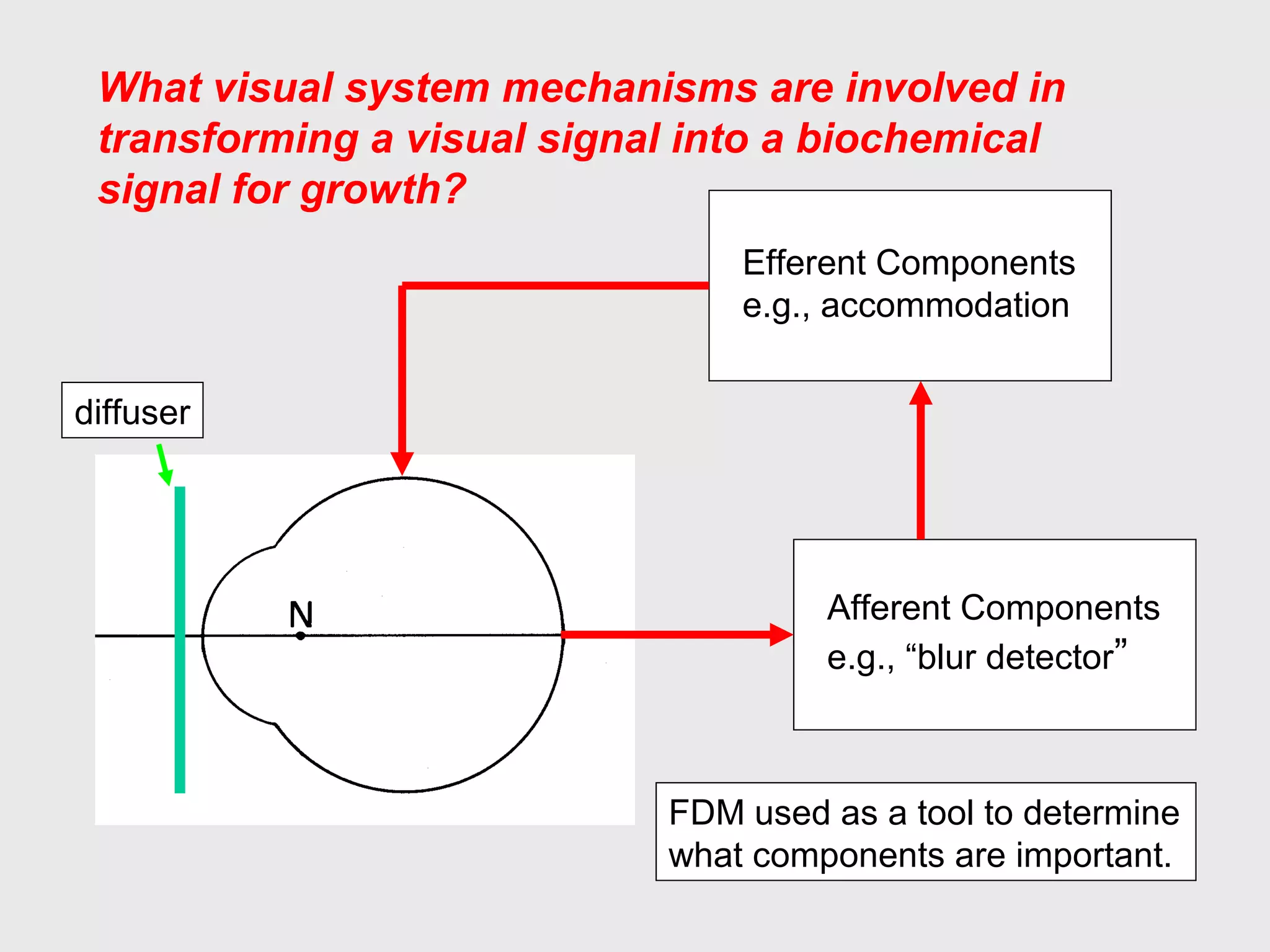 The visual system mechanisms that transform a visual signal into a biochemical signal for eye growth involve both afferent and efferent components located within the eye. Activity at a given retinal location controls the growth of the adjacent sclera. Key retinal components that regulate eye growth include acetylcholine, dopamine, glucagon, and components in the choroid such as retinoic acid. During myopic eye growth, the sclera exhibits increased creep rates and decreased proteoglycan synthesis. Atropine treatment has been shown to significantly reduce the progression of myopia compared to controls.