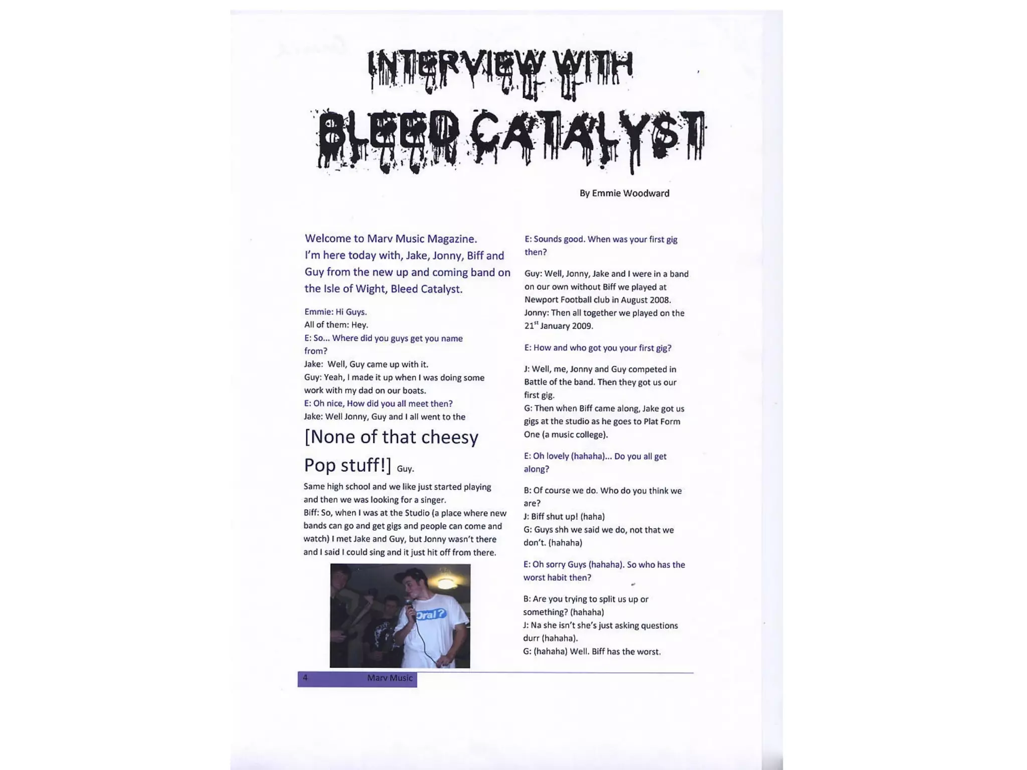 The author used basic layout conventions from existing magazines like Q, Kerrang, and NME. The masthead is at the top for visibility on shelves. Cover lines flank the main photo without cluttering the page.