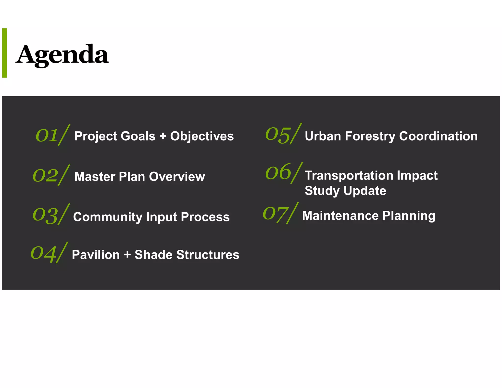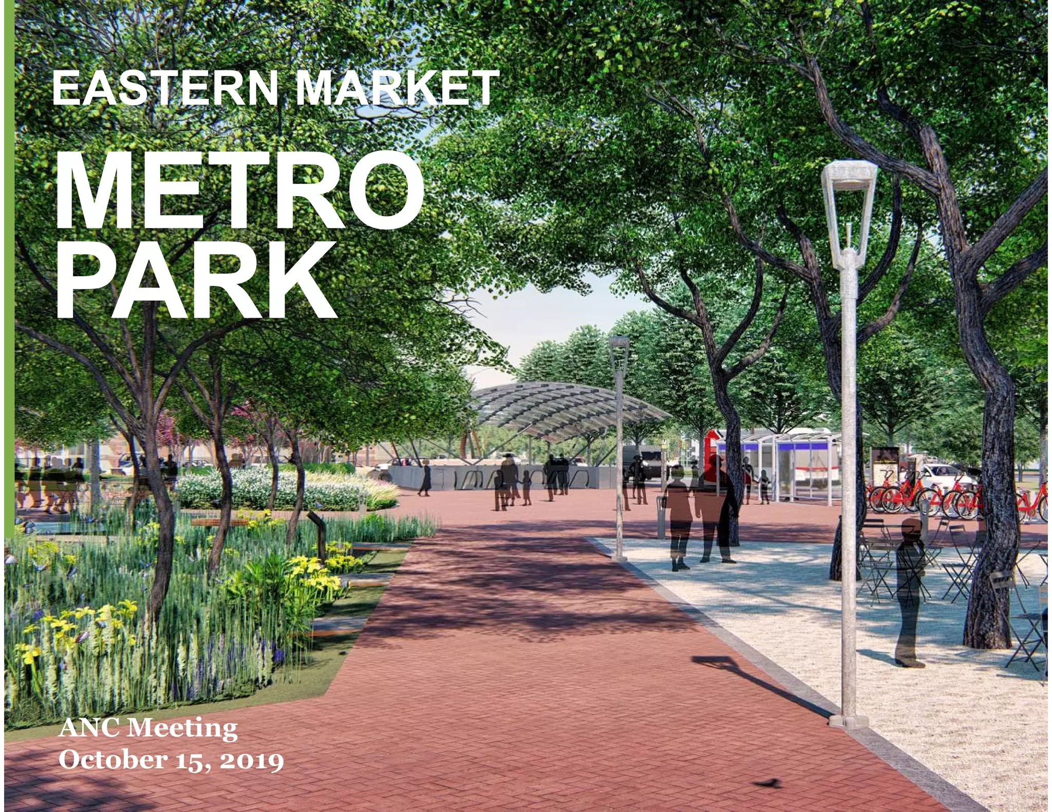 The document summarizes an ANC meeting about plans for updating Eastern Market Park in Washington, D.C. It discusses the project goals of creating a modern town square that improves safety, accessibility, and sustainability. Community input helped inform key design elements like the playground location and traffic calming measures. Renderings show plans for a pavilion, paths, plantings, and other features. A transportation study evaluated parking and traffic impacts, finding most intersections would operate acceptably with proposed changes like closing D Street. Maintenance responsibilities between agencies and a draft budget were also outlined.