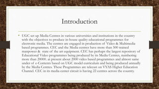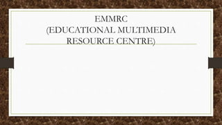 The Educational Multimedia Resource Centre (EMMRC) was established by the University Grants Commission to produce educational video and multimedia content. It has a large studio facility and produces over 2,000 video lectures and e-learning materials annually based on UGC curriculum. This content is broadcast on educational television channels and streamed online, reaching over 25 million students. The EMMRC conducts research and provides training to improve the quality of its educational programming and resources.